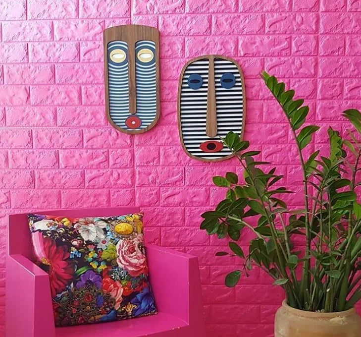 Lägg till en konstnärlig blickfångare i ditt rum med denna vackra mask som kombinerar färger, mönster och former. Den kommer utan tvekan att dra uppmärksamhet och skapa en mysig atmosfär i ditt hem.