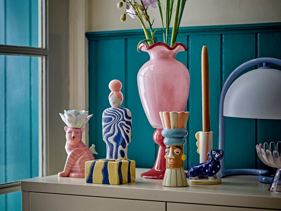 Ljusstaken Dachsy från Bloomingville ger din inredning en rolig och färgglad detalj. Denna ljusstake är formad som en tax och tillverkad av stengods, vilket ger den en unik och handgjord touch. Den handmålade finishen med en lekfull färgpalett kombinerar djupblått med vita prickar samt fina detaljer i beige, gult, orange och rosa. Varje ljusstake är unik eftersom den är handmålad, vilket innebär att små variationer i mönster och färgintensitet kan förekomma.