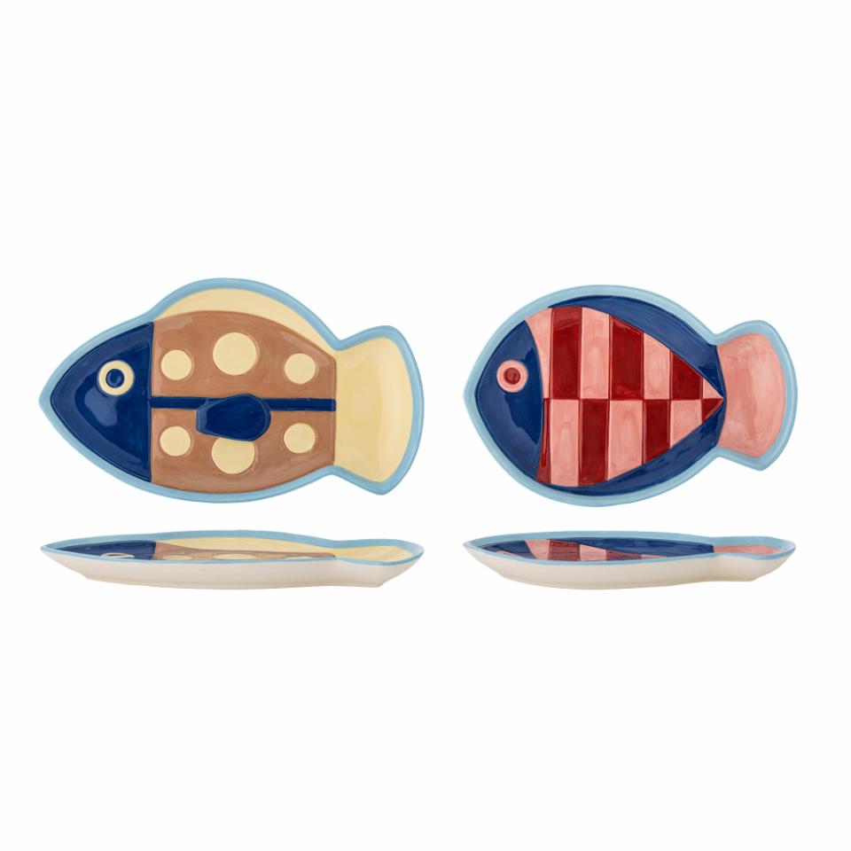 Skapa en lekfull och maritim atmosfär på ditt bord med dessa unika fiskfat från Bloomingville. Setet består av två stengodsfat, vart och ett format som en fisk. Den målade ytan är prydd med blå och varma toner, som tillsammans med den präglade dekorationen ger en fin struktur som gör faten till ett vackert blickfång.