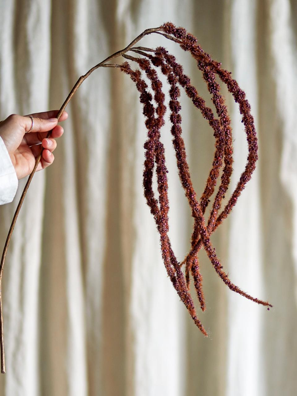 Den konstgjorda blomstjälken Foxtail från Bloomingville är det perfekta sättet att ge liv och färg till ditt hem. Med sina kaskader av små, rödbruna blommor ger denna stjälk ett mjukt och organiskt utseende som kommer att förhöja vilket utrymme som helst. Använd den ensam i en vas eller kombinera den med andra konstgjorda blommor för att skapa en vacker bukett.