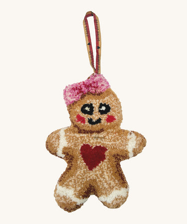 Fru Peberkage Gifthanger er en charmerende håndtuftet dekoration, der bringer varme og glæde ind i dit hjem. Med sine rosafarvede kinder, glitrende øjne, bløde lyserøde sløjfe og klare røde hjerte spreder denne peberkagepige julestemning, hvor end hun hænges op.