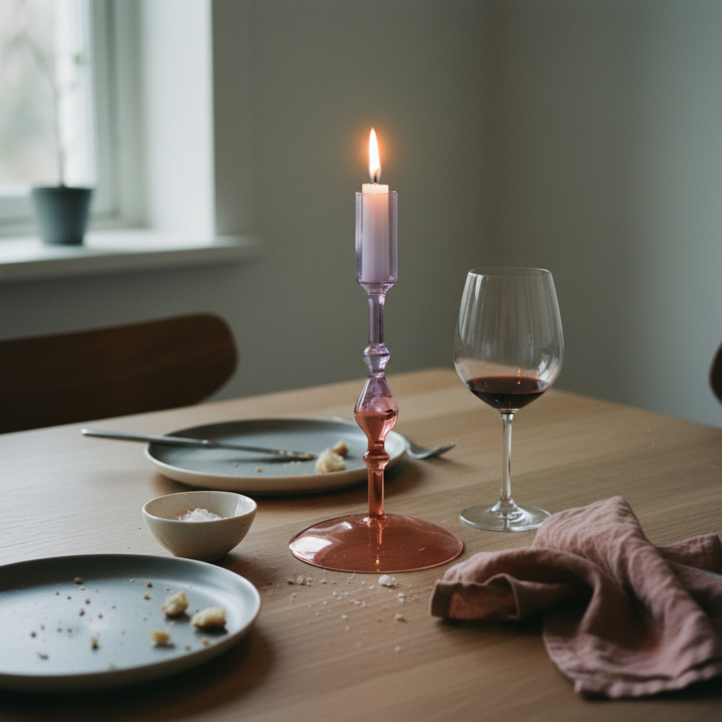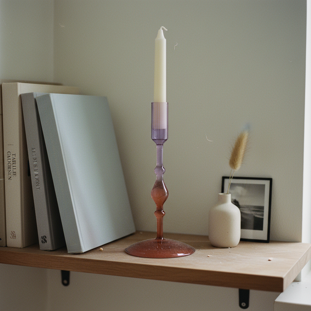 De varma burgundy- och lila nyanserna i glaset skapar en mysig atmosfär när ljuset från ljuset reflekteras genom det färgade glaset. Materialvalet ger inte bara ett elegant utseende, utan gör också att ljusstaken kan fungera som en dekorativ detalj även när den inte används.