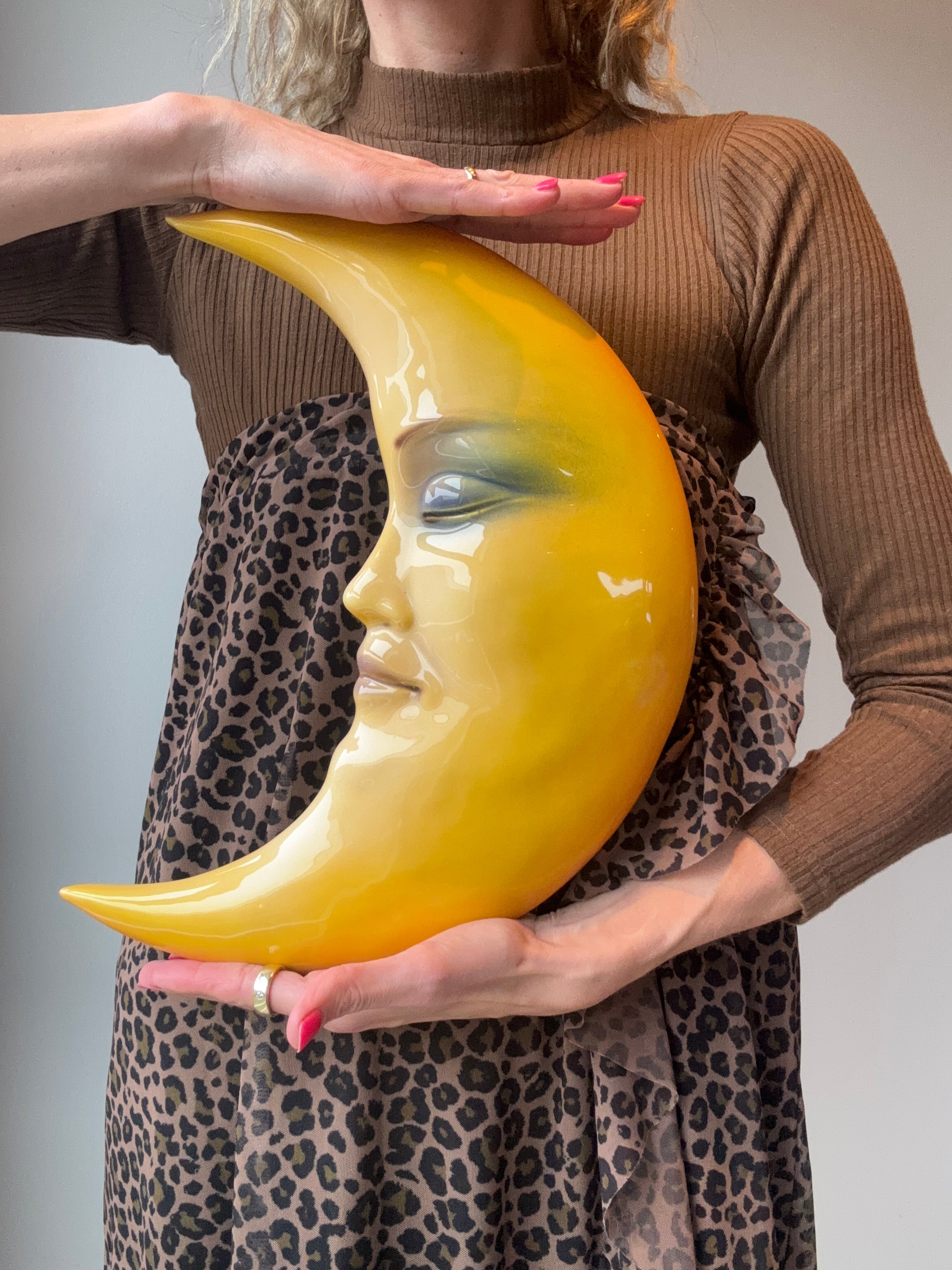 Denna charmiga väggdekoration i form av en måne med ett sovande ansikte är tillverkad i Italien av ett familjeägt företag. Den keramiska figuren finns i vackra nyanser av gult och orange, vilket ger en varm och livfull touch till vilken vägg som helst. Varje måne är handmålad, vilket ger varje exemplar ett unikt utseende med fina detaljer i ansiktsuttrycket.