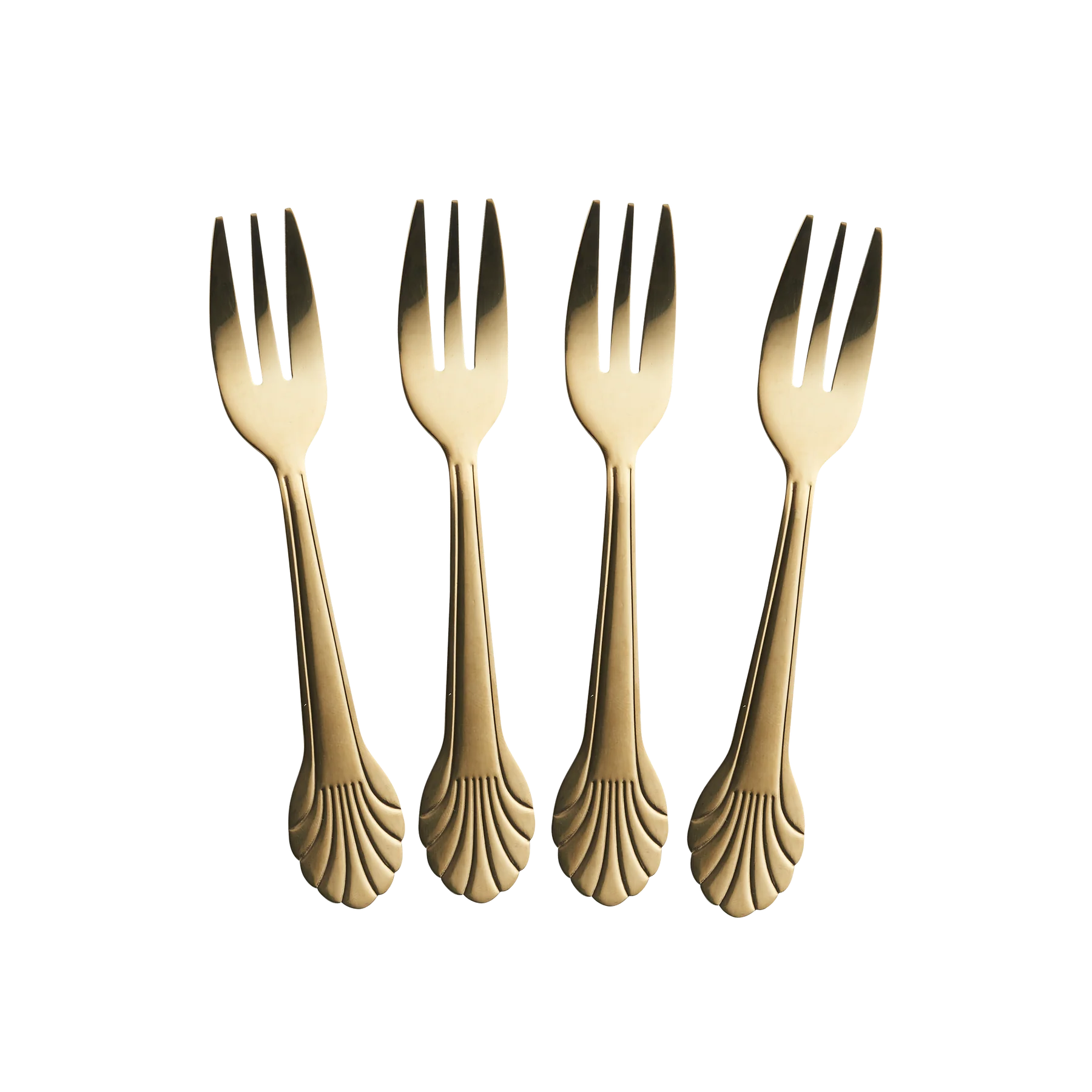 Gafflarna är tillverkade av slitstarkt rostfritt stål med en vacker guldfinish som ger dem ett lyxigt utseende. Den gyllene ytan skapar kontrast på bordet och framhäver dina serveringar, oavsett om det är för vardagsbruk eller till fest. Observera att den gyllene finishen kan blekna med tiden, särskilt vid diskmaskin.