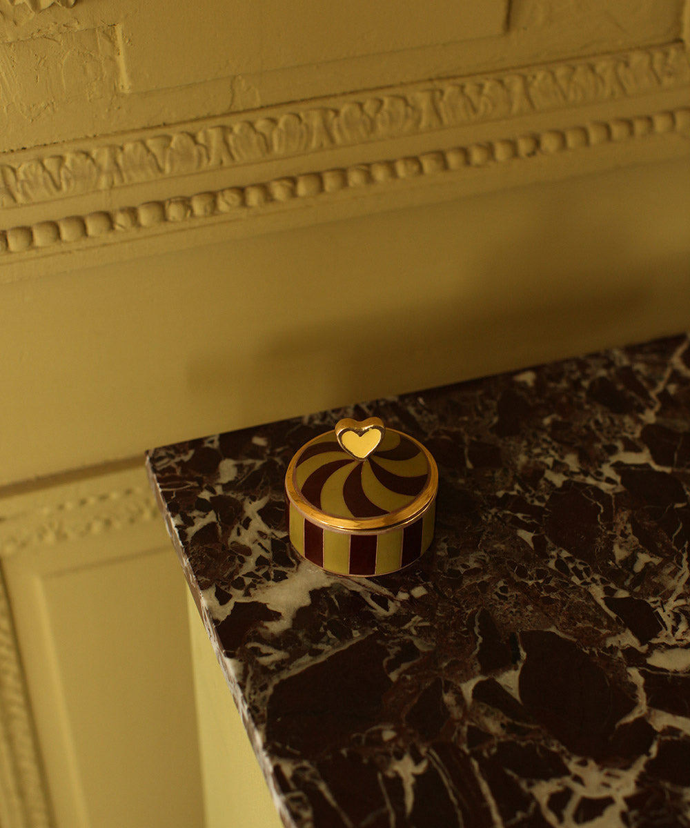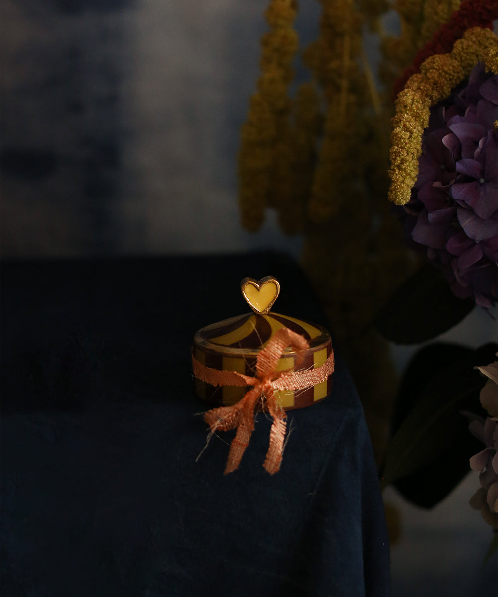 Heart Circus-burken från Doing Goods är inte bara en förvaringslåda; det är ett konstverk som ger glädje och färg till ditt utrymme. Denna handgjorda burk är tillverkad av 60 % återvunnen mässing och 40 % harts, vilket gör den både vacker och hållbar. Dess runda form, distinkta ränder i gult och vinrött, och den söta hjärtformade knappen på locket ger den ett unikt och livligt utseende.