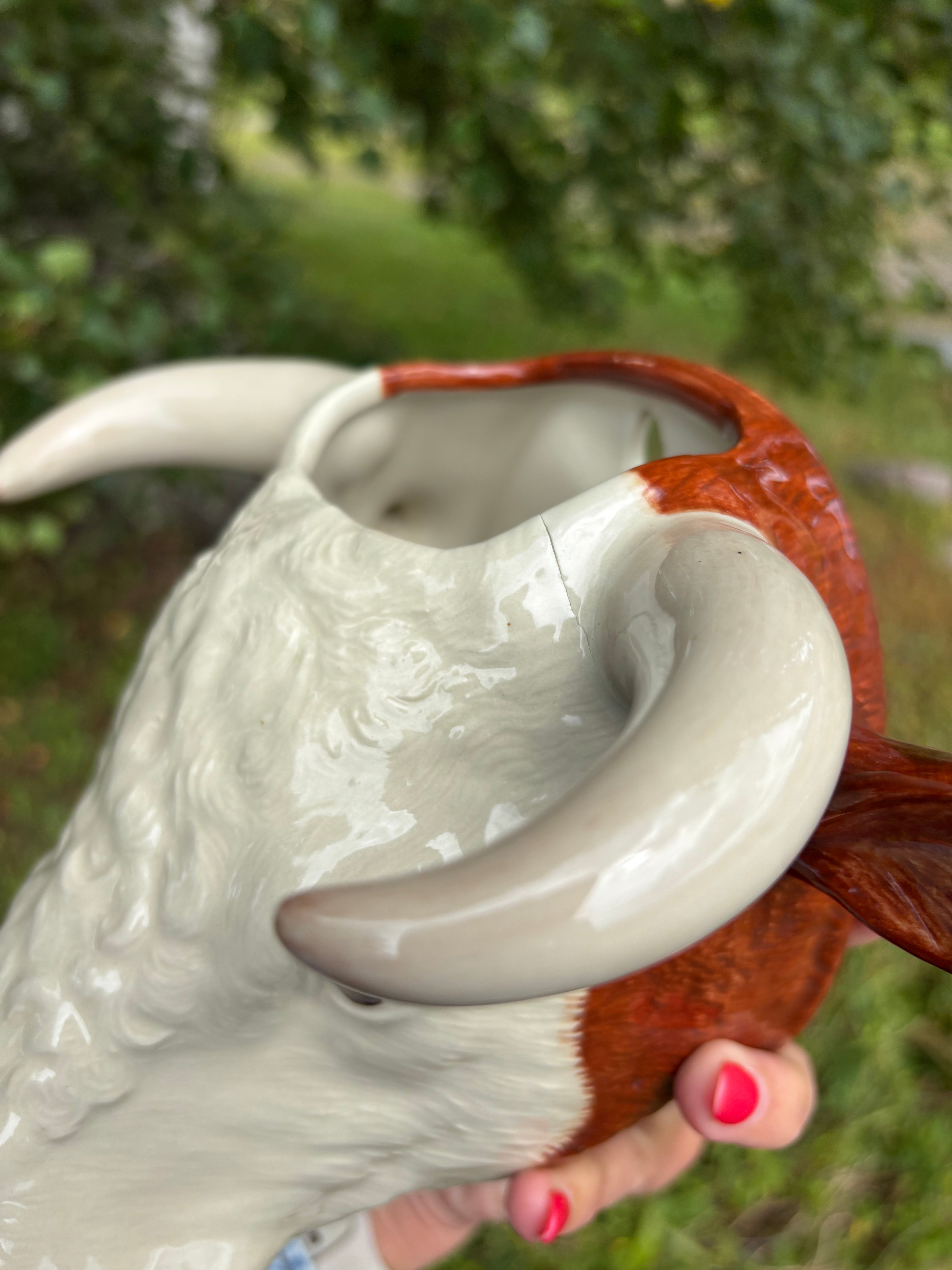 Denna charmiga väggvas i form av en Herefordtjur är handmålad stengods från Quail. Den rustika och karaktärsfulla vasen kan monteras på väggen och användas för kortstjälkade blommor, en liten växt eller som en praktisk hållare för till exempel penslar.