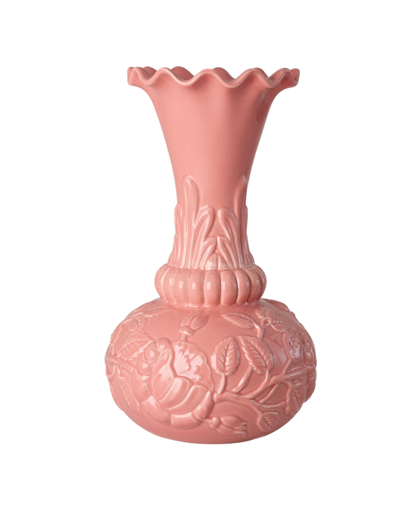 Den korallfärgade keramikvasen från Rice är en riktig skönhet som ger liv och färg till alla rum. Den charmiga korallfärgen i kombination med det präglade blommönstret ger den en unik och lekfull karaktär, perfekt för både färska och torkade blommor.