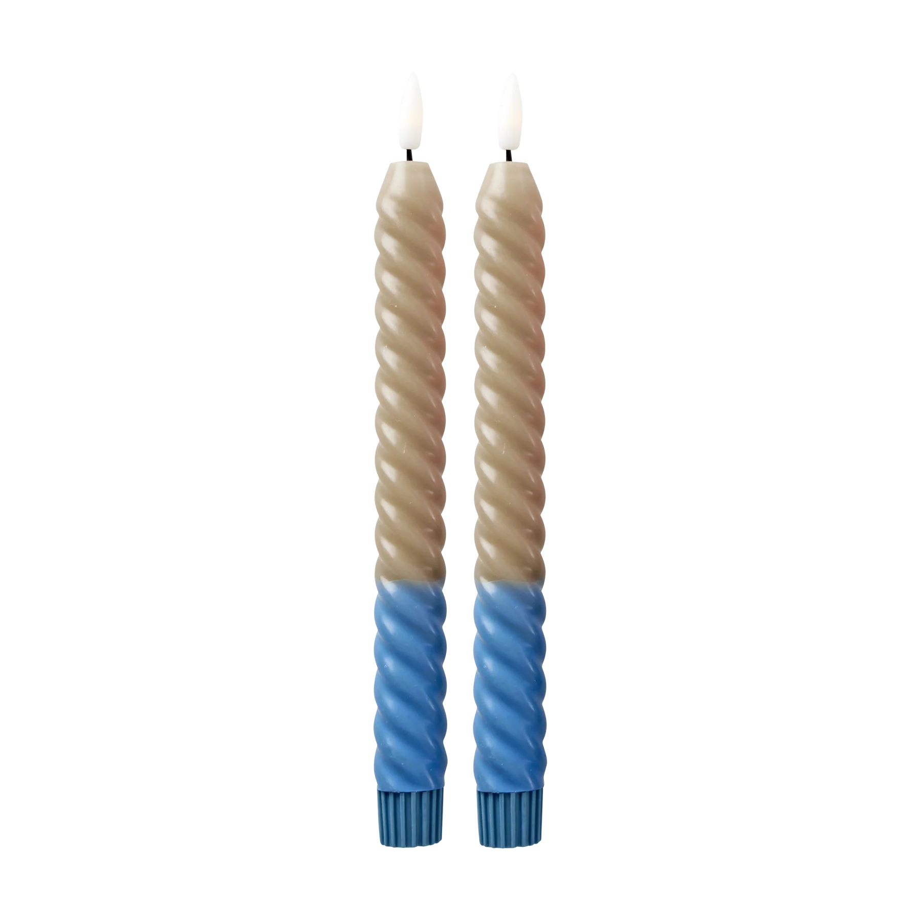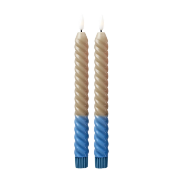 Dessa fina, vridna LED-lampor i nyanser av mörk sand och duvblått ger ditt hem en unik touch. Med sin livfulla, fladdrande låga skapar de en mysig atmosfär som inbjuder till avkoppling och trevliga stunder.