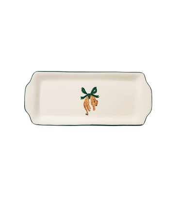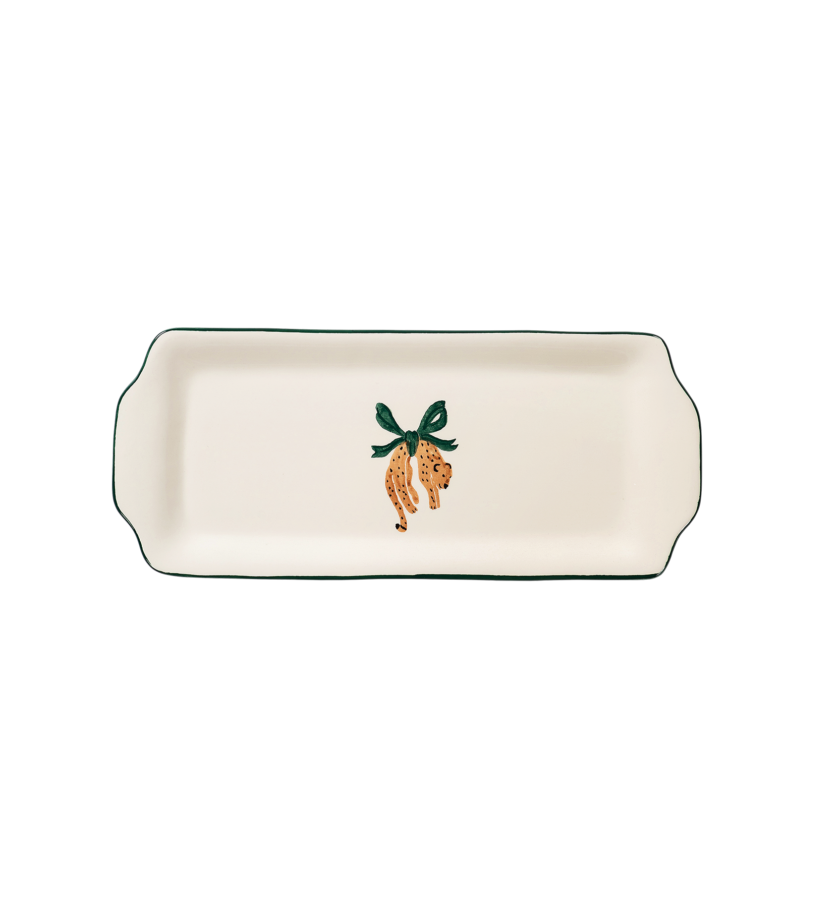 Forkæl dine gæster med det smukke leopardfad fra Anna + Nina. Dette fad er ikke bare en praktisk genstand, men også et kunstværk, der pryder ethvert bord. Den håndmalede leopard og sløjfen i dyb grøn farve tilføjer et unikt og eksotisk touch til din borddækning.
