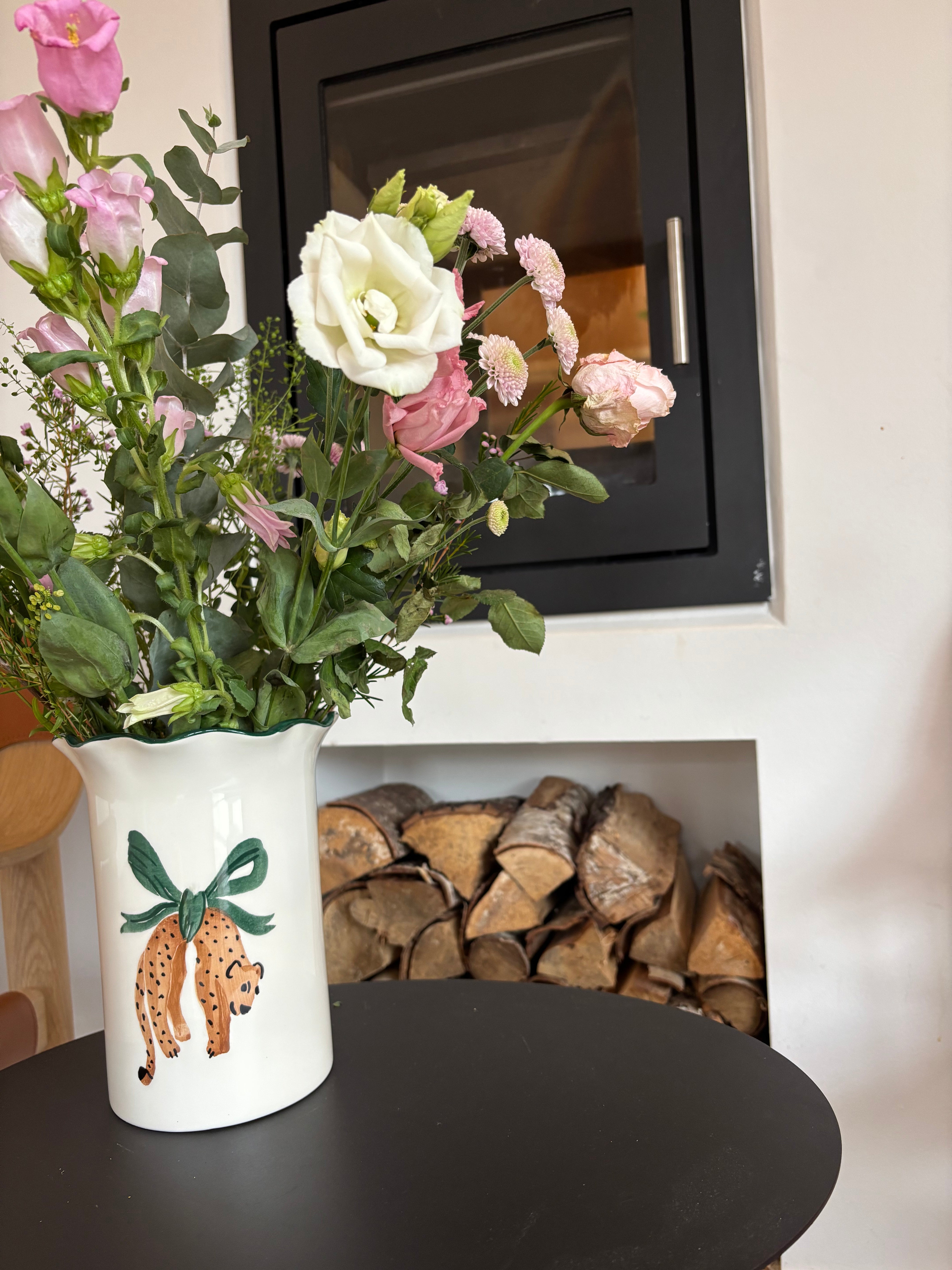 Denna handmålade leopardvas från Anna + Nina är tillverkad i stengods och kombinerar funktion med en iögonfallande design. De formade kanterna och det karakteristiska leopardmönstret ger vasen ett unikt uttryck som kan användas både till blommor och som ett dekorativt element i hemmet.