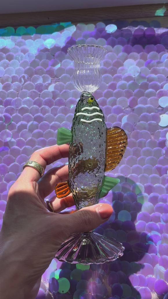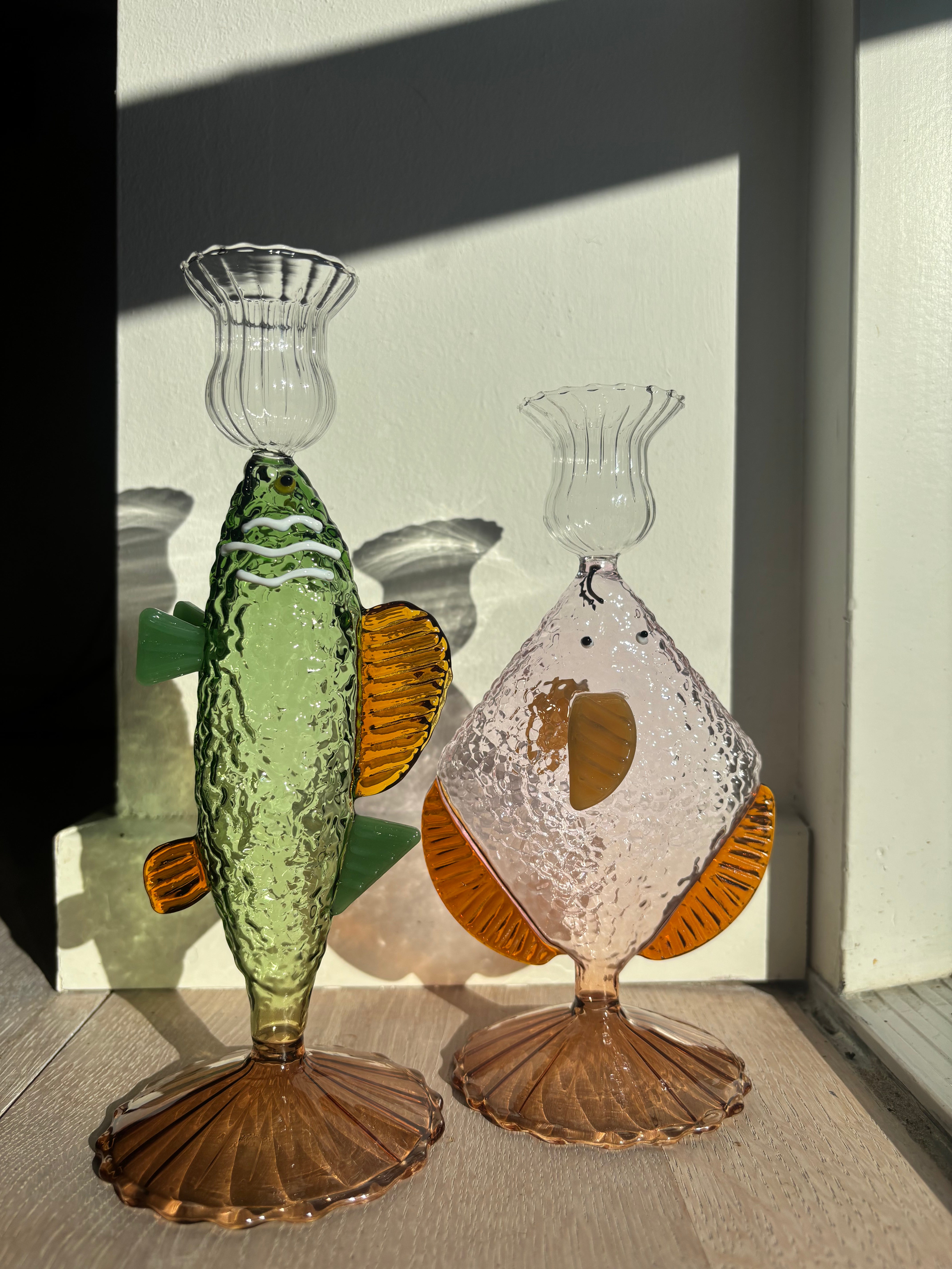 Dekorativ grön fiskljusstake i unikt borosilikatglas