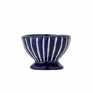 Nini-skålen från Bloomingville är det perfekta tillskottet till ditt bord, både för vardagsbruk och speciella tillfällen. Med sin mjuka, vågiga form och eleganta utsvängda botten ger skålen en extra touch av charm till varje måltid. Den glansiga blå glasyren med vertikala elfenbensfärgade ränder är inte bara en fröjd för ögat, utan också ett bevis på det hantverk som kännetecknar Bloomingville.