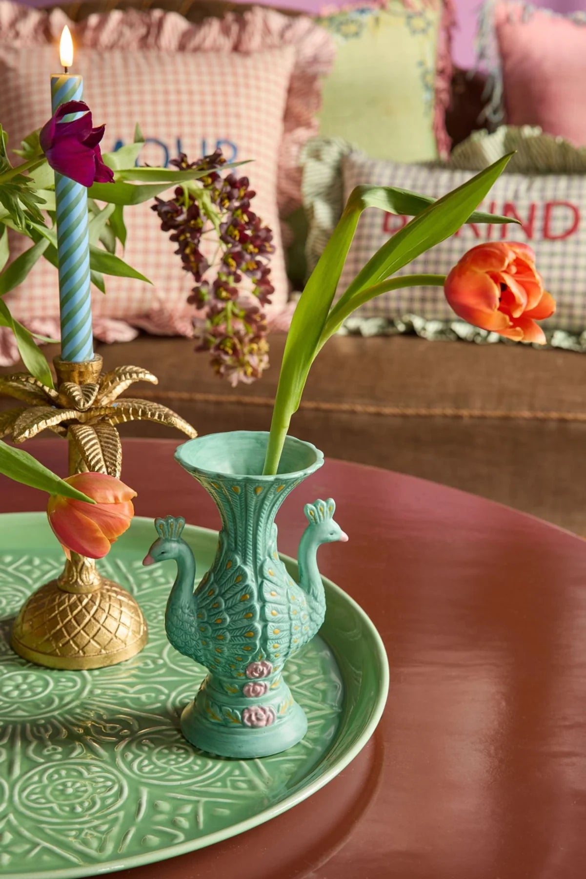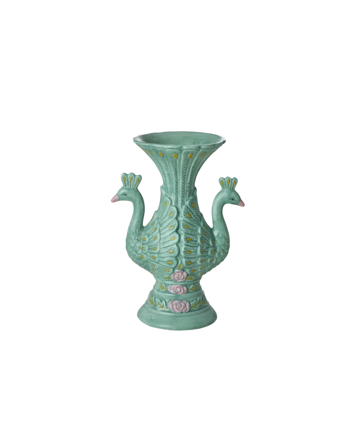 Vasens iögonfallande design fungerar både som en praktisk vas för blommor och ett dekorativt element i sig. De omsorgsfullt utformade påfågelmotiven ger vasen karaktär och djup som drar till sig uppmärksamhet och skapar samtal bland gästerna.