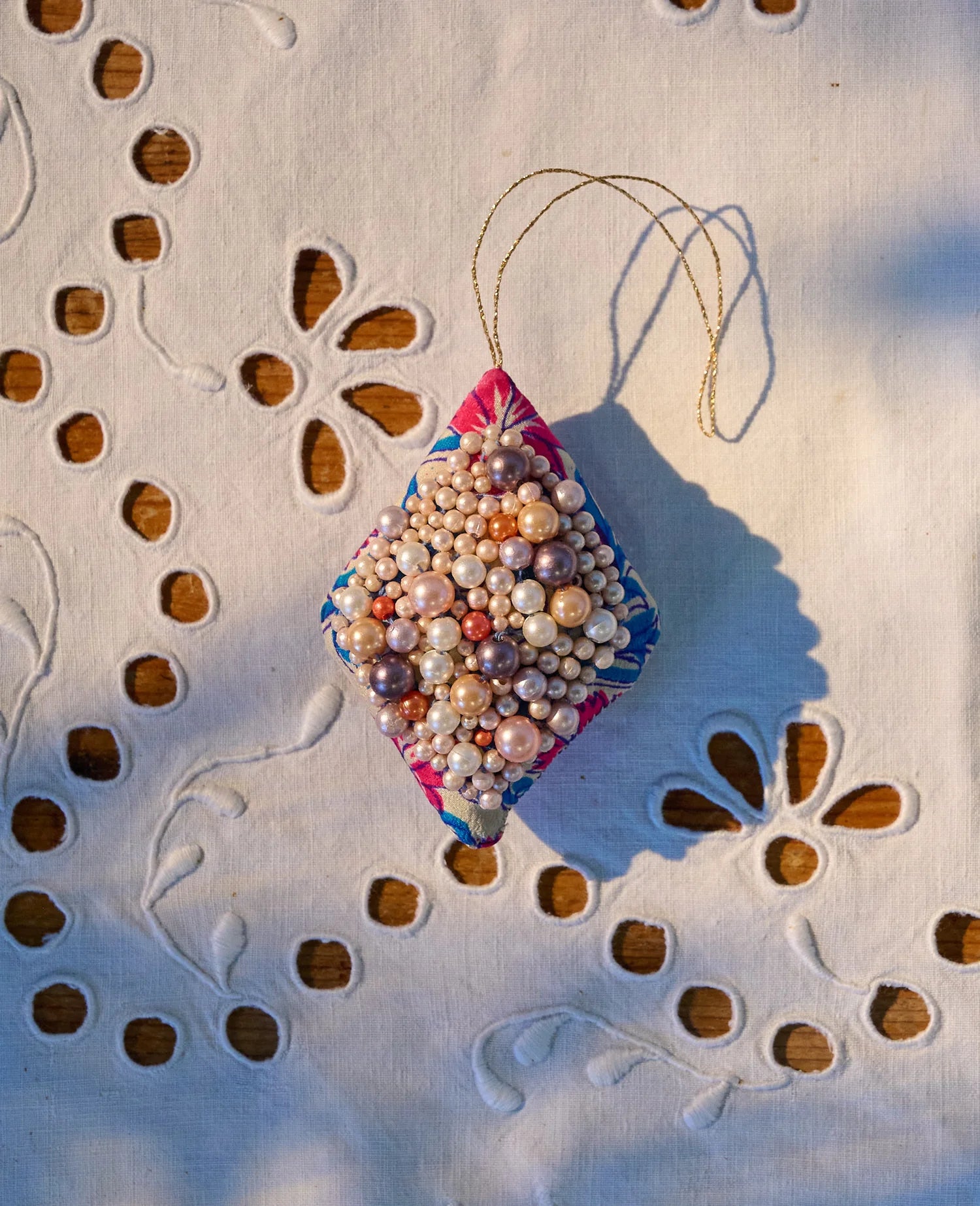 - Hånddekoreret: Ornamentet er udsmykket med perler i perlemor i forskellige nuancer og størrelser, hvilket giver det et unikt og personligt præg.