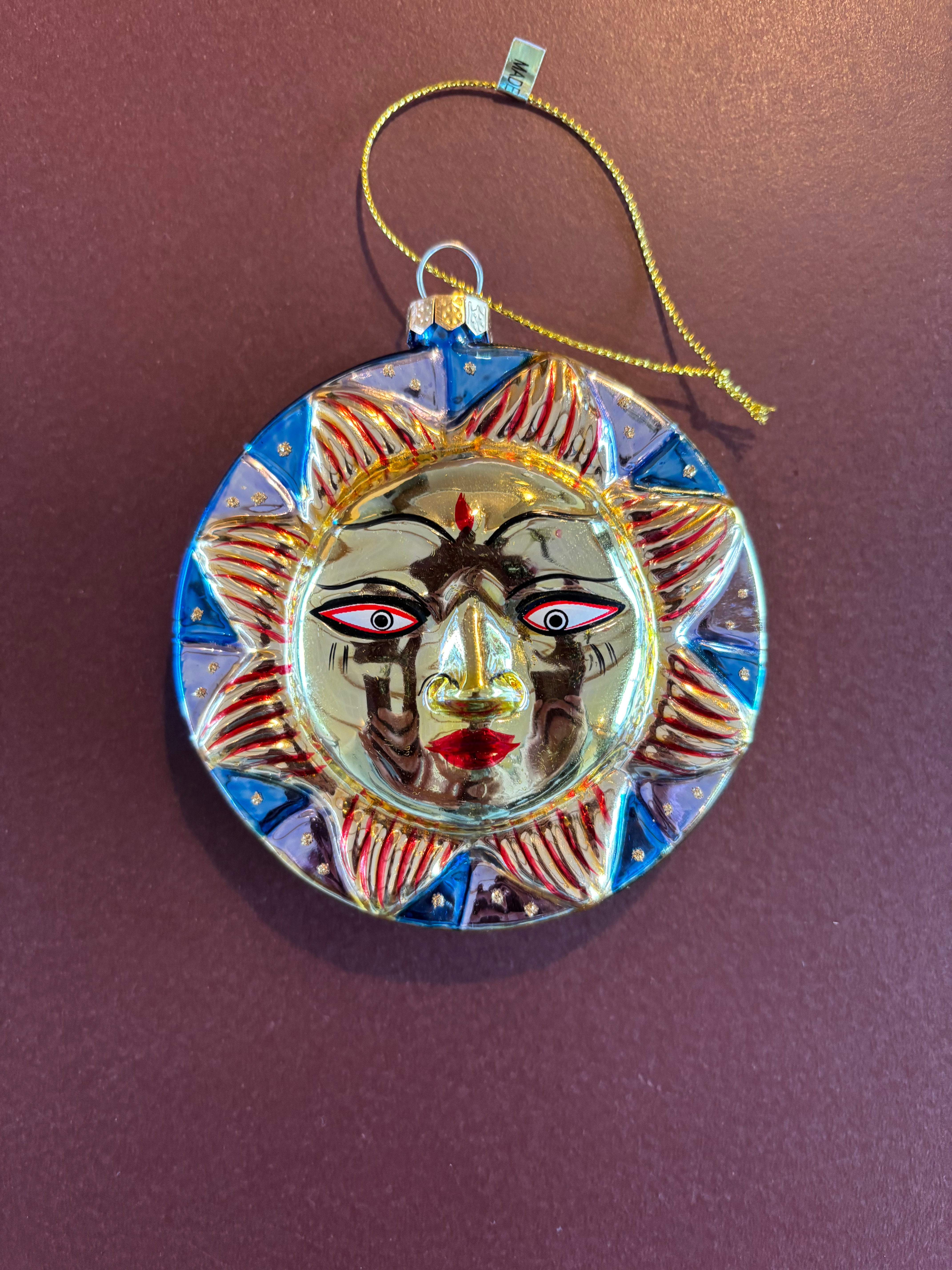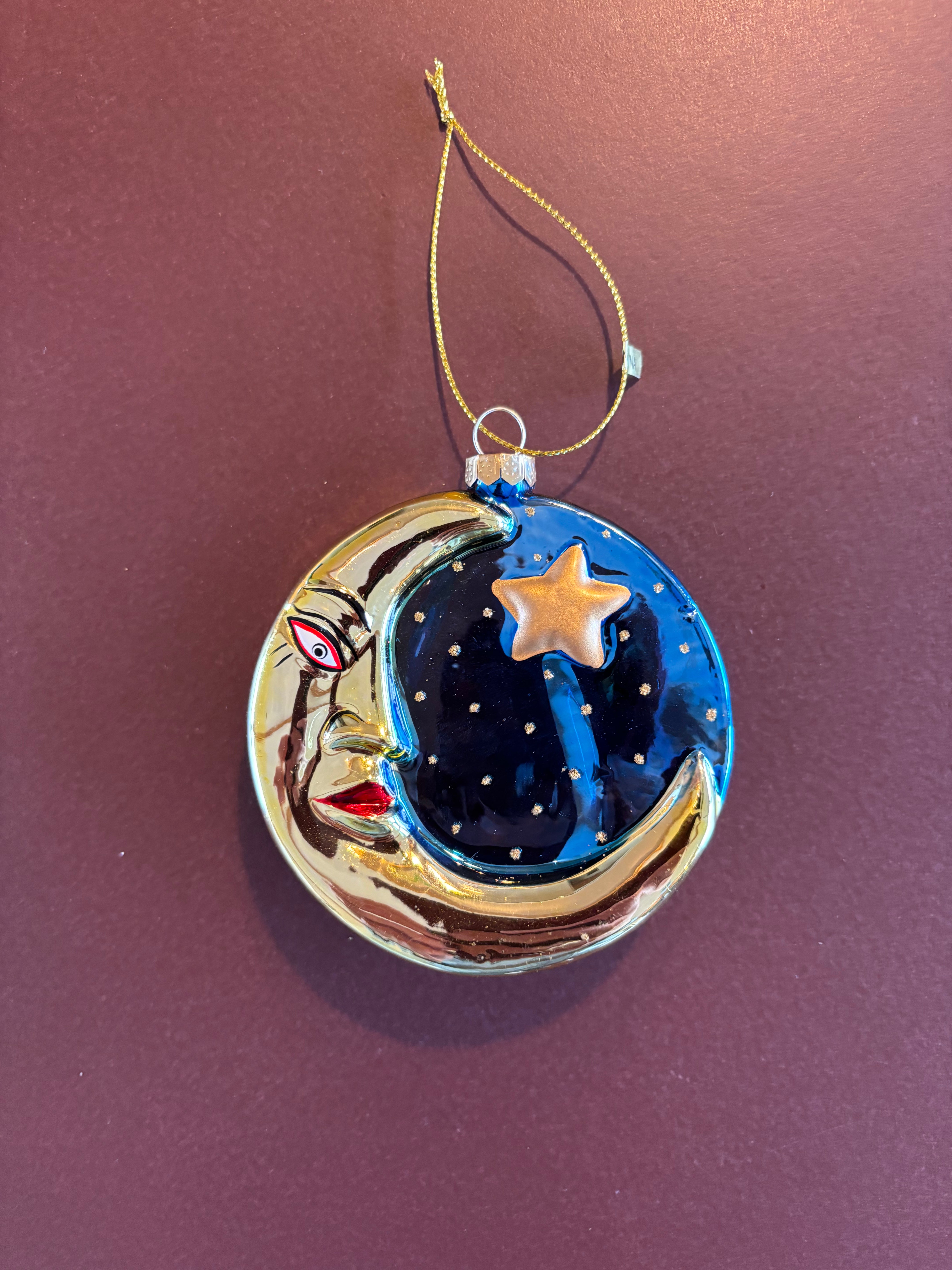 Denna handgjorda julgransprydnad från Cody Foster förenar solen och månen i en vacker design som ger ett drömlikt inslag till din juldekoration. Den handmålade glasprydnaden har en unik karaktär med sina detaljerade former och noggranna färgsättning, vilket gör den till ett speciellt tillskott till din juldekoration.