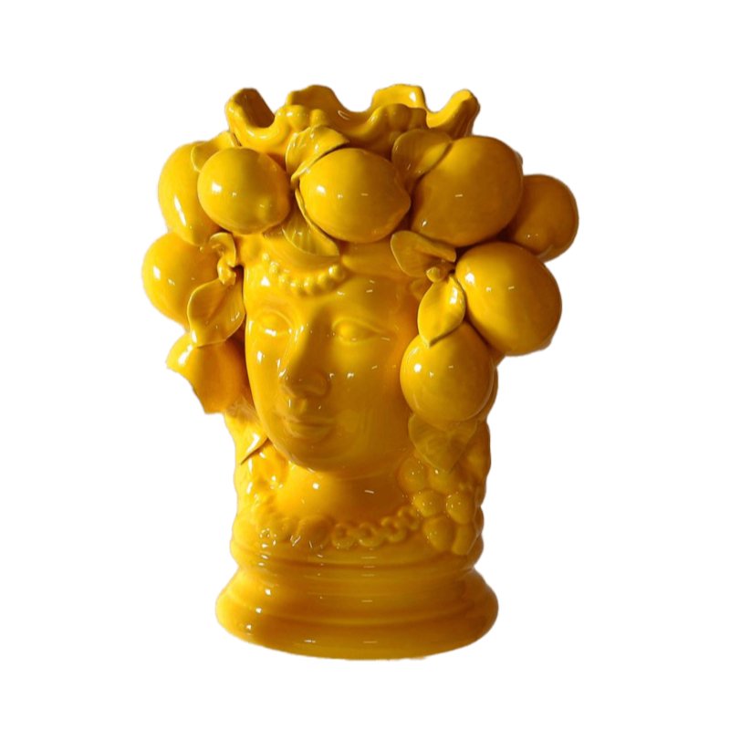 Äntligen kan vi på Dims Studio presentera denna fantastiska Testa Di Moro-vas. Vi har väntat länge på att kunna sälja de typiska sicilianska ornamenten, och nu finns de äntligen tillgängliga i butik och online. Denna Testa Di Moro-vas avbildar en vacker kvinna, och är därmed ett sant exempel på en klassisk italiensk design. Testa Di Moro-vaserna har stort konstnärligt och historiskt värde i Italien, vilket gör dem mycket speciella. De gamla berättelserna om den traditionella keramiken berättar historien om en vacker kvinna som blir djupt förälskad i en man. Denna vas är därför ett landmärke för en mytisk och olycklig historia, samt en unik heminredning. Förutom återspeglingen av den vackra kvinnan har vasen flera fina detaljer. Runt kvinnan har en huvudbonad av små citroner i keramik lagts till. Detta gör den extra dekorativ. Med en handgjord vas som denna kan du tillföra en italiensk atmosfär till ditt hem.
