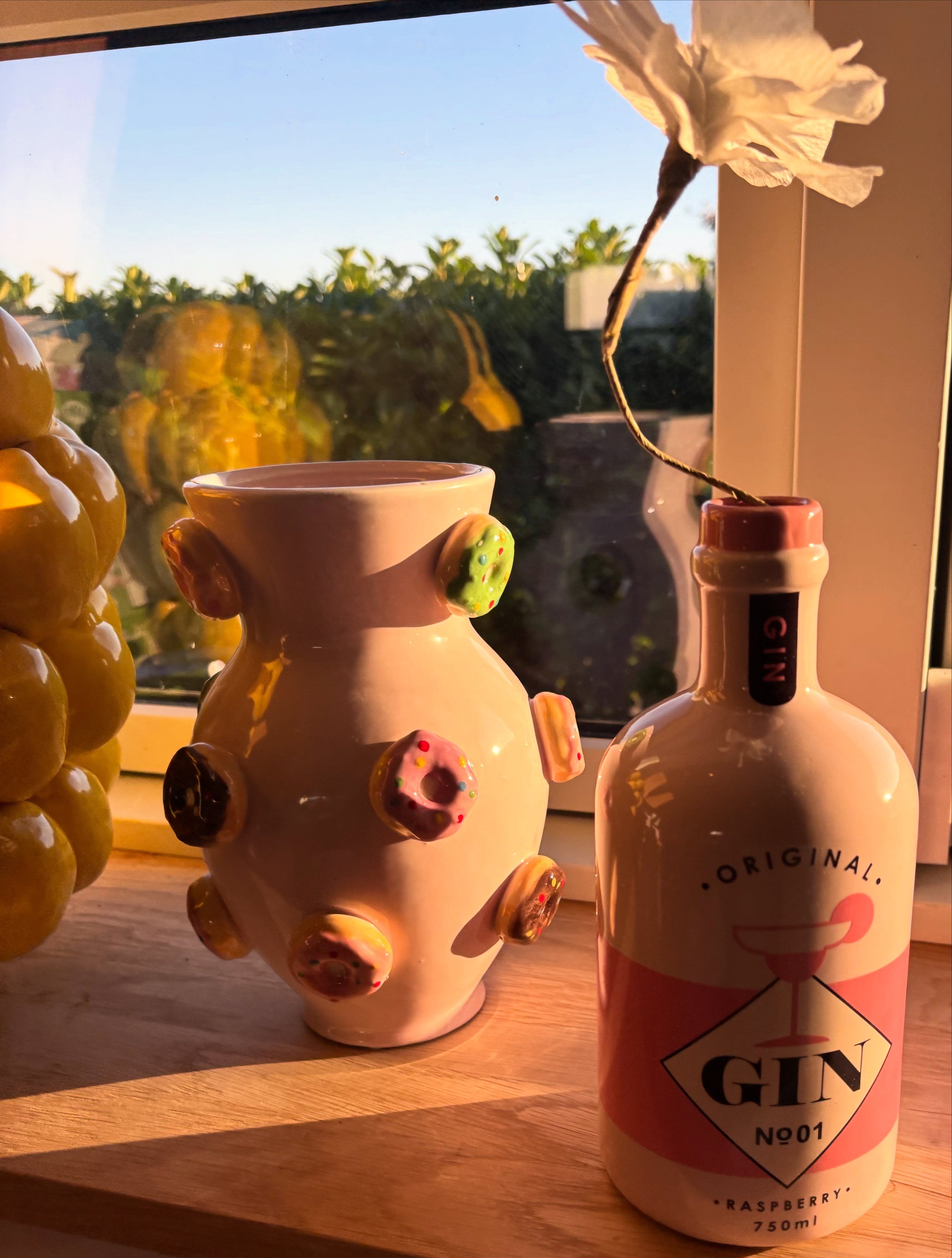 Rosa vas med munkmotiv ger en lekfull touch till hemmet